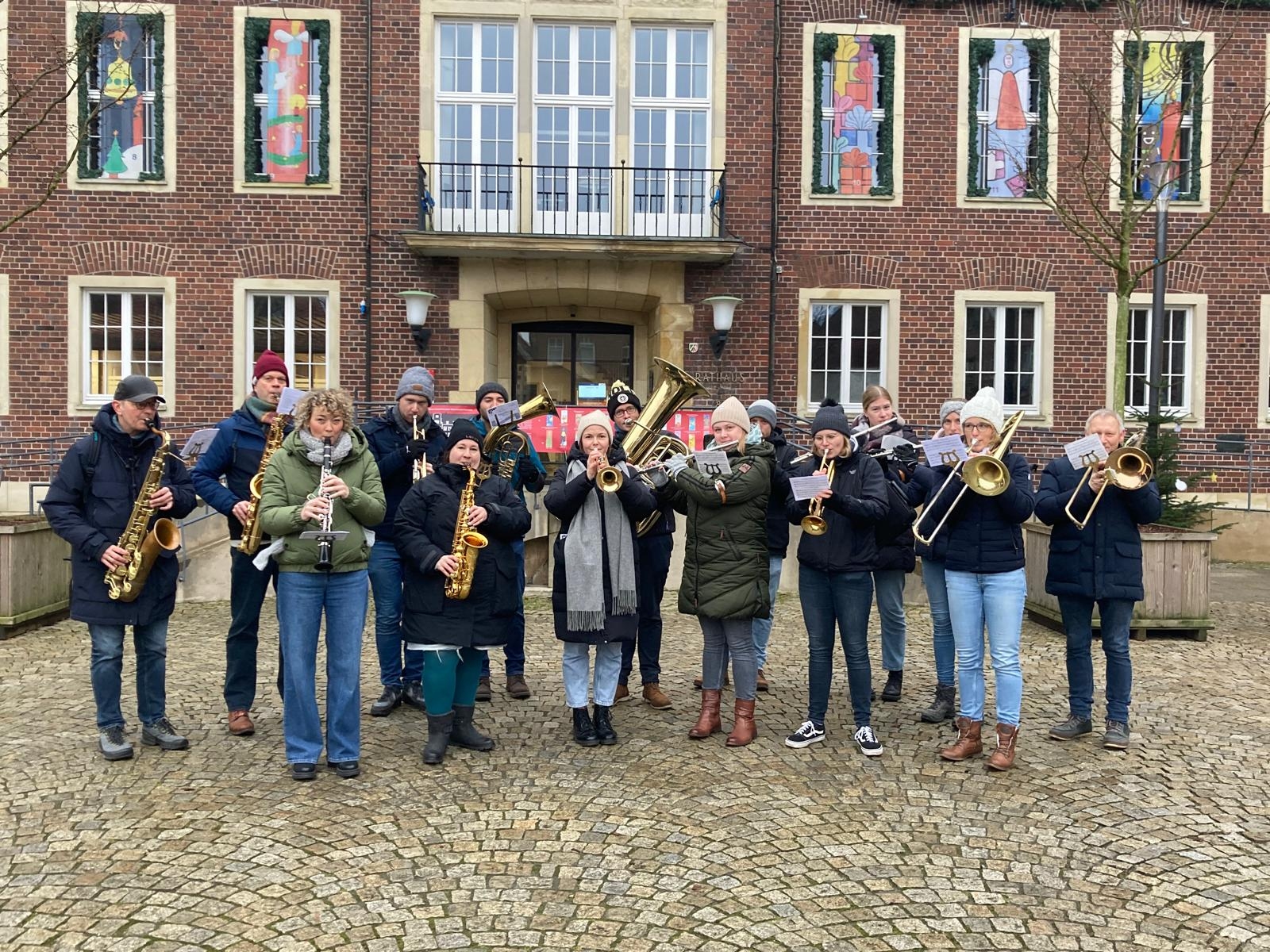 Am Samstag vor dem 3. Advent waren wir wieder in der Coesfelder Innenstadt unterwegs, um die Menschen mit Weihnachtsliedern auf die Adventszeit einzustimmen. Als Walking Acts ging es einmal quer durch die Innenstadt – mit Musik, guter Laune und vielen freundlichen Begegnungen am Wegesrand. Im Anschluss haben wir den Seniorinnen und Senioren im Katharinenstift ein weihnachtliches Ständchen gespielt. Die Freude, die wir dort erleben durften, hat uns sehr berührt. Danach führte uns unser Weg weiter ins Coesfelder Krankenhaus, wo wir von Station zu Station gezogen sind und auch dort mit bekannten Weihnachtsliedern ein wenig vorweihnachtliche Stimmung verbreiten konnten. Diese Aktion gehört für uns jedes Jahr zu den ganz besonderen Momenten der Adventszeit. Musik direkt zu den Menschen zu bringen, ihnen ein Lächeln ins Gesicht zu zaubern und gemeinsam ein paar ruhige, festliche Augenblicke zu teilen – das geht uns jedes Mal aufs Neue sehr zu Herzen.